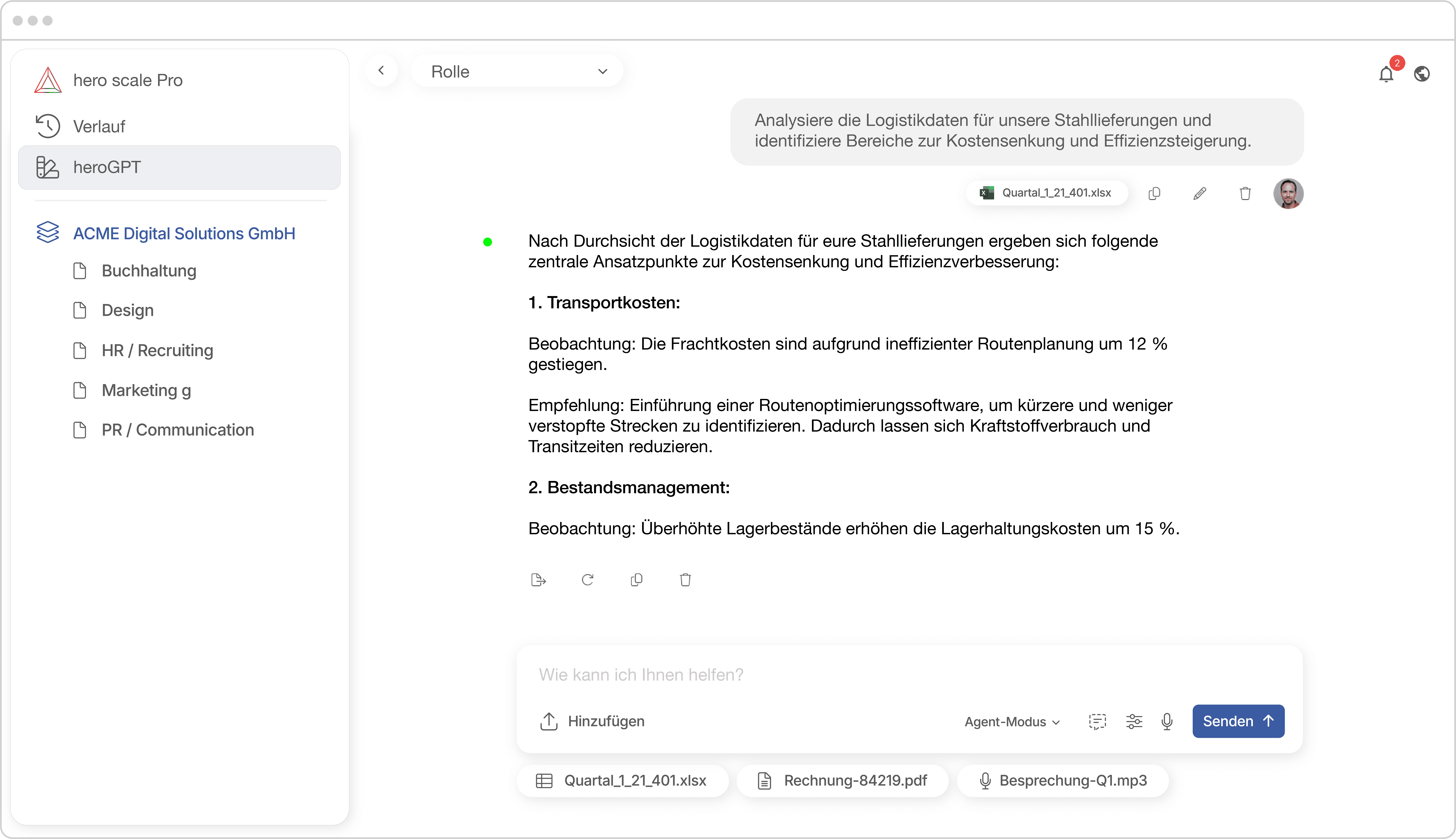 heroGPT erkennt, ob Word-, Excel- oder PDF-Dokumente verarbeitet werden sollen und steuert dafür definierte Tools. So werden aus Chat-Anfragen prozessfähige Ergebnisse – strukturiert, anschlussfähig und mit Übergaben an eure Systeme.